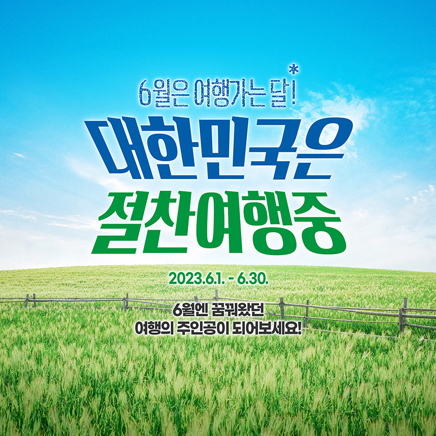 문화체육관광부와 한국관광공사가 국내 여행 활성화를 통해 지역경제활성화 목적으로 6월 1일(목)부터 6월 30일(금)까지 '2023 여행가는 달' 행사를 진행한다고 합니다.