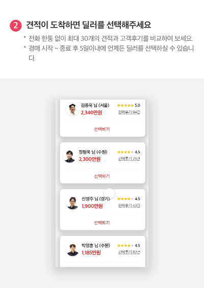중고차플랫폼의 비교경매를 통해 딜러를 선택하게 되고 방문하신 딜러 분에 따라 차량 가격이 달라지기 때문에 여러 플랫폼을 활용하시길 추천드립니다.